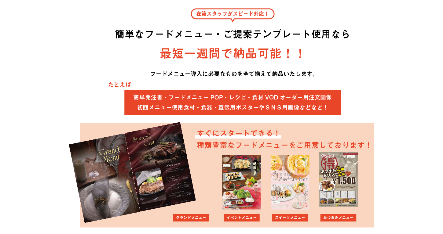 写真撮影からデザイン、製本まで自社で行っているからこそ、提案まで最短2週間、納品まで4週間で行う事ができます。シズル感で利用客の食欲をかきたて、食の満足や感動を提供することで、リピーターを獲得することができます。