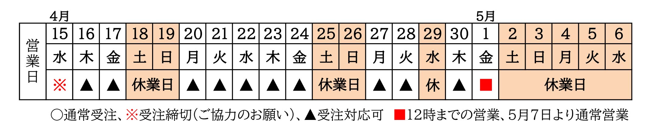 2026.03.19 【2026年】GW期間中 受注・配送スケジュールのご案内 2026年 GW期間中 受注・配送のお願い 拝啓、貴社はますますご盛栄のこととお慶び申し上げます。平素は格別のお引き立てをいただき、厚くお礼申しあげます。さて、誠に勝手ながら標題の連休の配送を案内させていただきます。何かとご不便をお掛けする事と存じますが何卒宜しくお願い申し上げます。 GW休業期間 2026年 5月2日(土)~ 2026年 5月6日(水) ※2026年 5月1日(金)は午前12時まで営業いたします。 営業開始日 2026年 5月7日(木)~ 上記期間中(4月16日着~5月7日着分)の受注分につきましては、在庫確保をさせて頂きたく、4月15日(水)午前11時までにご注文を頂きますよう御協力の程、宜しくお願い申し上げます。(メーカー直送商品の受注につきましては 4月14日(火)までにご注文をいただきますようお願い致します。) 4月15日(水)午前11時までにご注文を頂きましたお客様から優先に出荷させて頂きますが、16日着(木)でのご注文は大変混雑が予測され、運送手配にも影響があり、受注状況により着日変更のお願いをさせて頂く場合がございます。尚、4月16日(木)以降もご注文を承っておりますが、欠品や配送の遅延が発生する恐れがございます。 発注書に必ず希望着日の記載をお願い致します。(上記カレンダー参照)ご記入が無い場合、受注状況により4月17日(金)以降の発送とさせて頂く場合がございます。尚、配達時間指定は出来かねます。ご了承の程、宜しくお願い申し上げます。事前のご注文分に追加を頂きました際、同梱出来なかった場合は、別便でのご案内となります。 配送詳細は添付ファイルをご参照いただき、ご不明な点がございましたら、ナコム管理部までご連絡ください。何かとご不便をお掛けする事と存じますが、何卒宜しくお願い申し上げます。 以上 令和8年度GW配送のご案内 【2025年-2026年】年末年始期間中 受注・配送スケジュールのご...