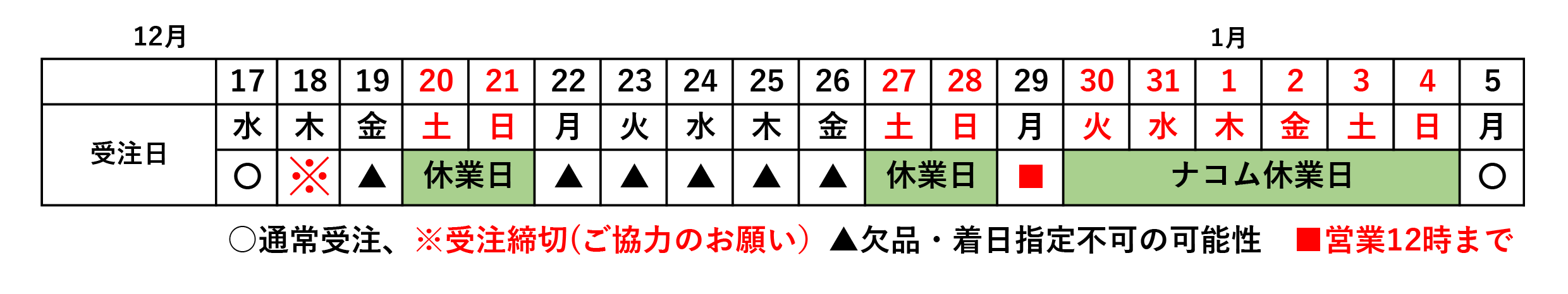 2025.11.26 【2025年-2026年】年末年始期間中 受注・配送スケジュールのご案内 2025年-2026年 年末年始期間中 受注・配送のお願い 拝啓、貴社はますますご盛栄のこととお慶び申し上げます。平素は格別のお引き立てをいただき、厚くお礼申しあげます。さて、誠に勝手ながら標題の連休の配送を案内させていただきます。何かとご不便をお掛けする事と存じますが何卒宜しくお願い申し上げます。 年末年始休業期間 2025年 12月30日(火)~ 2026年 1月4日(日) ※2025年 12月29日(月)午前12時までの営業 営業開始日 2026年 1月5日(月)~ ●年末年始期間中(12月30日~1月5日着分)の受注分につきましては、在庫確保をさせて頂きたく、12月18日(木)午前11時までにご注文をいただきますようご協力の程、宜しくお願い申し上げます。(メーカー直送商品の受注につきましては 12月17日(水)までにご注文をいただきますようお願い致します。) ●12月18日(木)午前11時までにご注文を頂きましたお客様から優先に出荷させていただきます。19日(金)着、22日(月)着のご注文は大変混雑が予測され、運送手配にも影響があり、受注状況により着日変更のお願いをさせて頂く場合がございます。尚、12月19日(金)以降もご注文を承っておりますが、欠品や配送の遅延が発生する恐れがございます。 ●発注書に必ず希望着日の記載をお願い致します。(日曜・祝日着も可能です。)ご記入が無い場合、受注状況により23日(火)以降の発送とさせて頂く場合がございます。又、配達時間指定は出来かねます。ご了承の程、宜しくお願い致します。 ●2025年12月29日(月)の営業時間は昼12時までの営業とさせていただきます。ご了承の程、宜しくお願い致します。 以上 令和7年度年末年始配送のご案内 【2025年】お盆休み期間中 受注・配送スケジュールのご案内